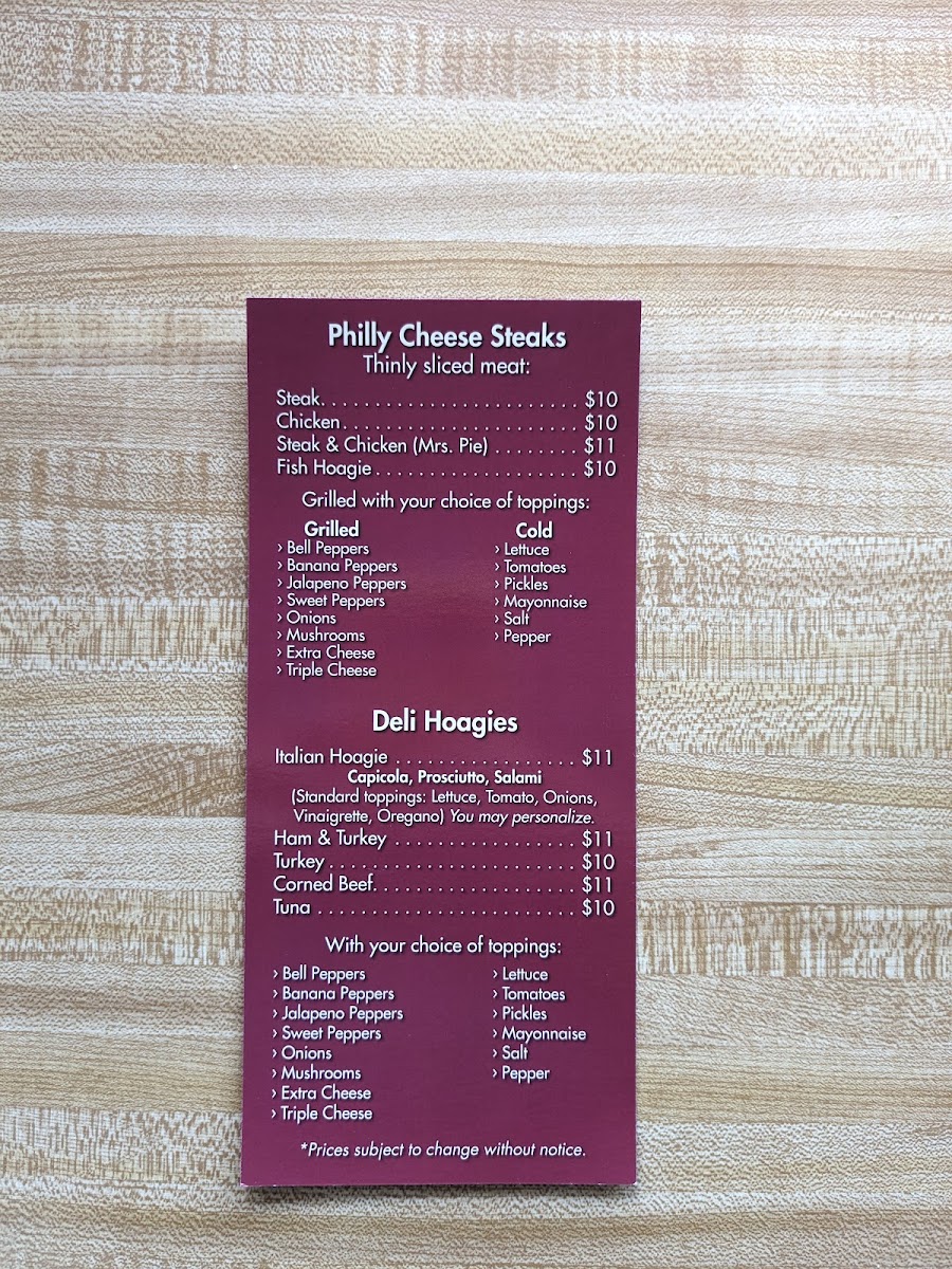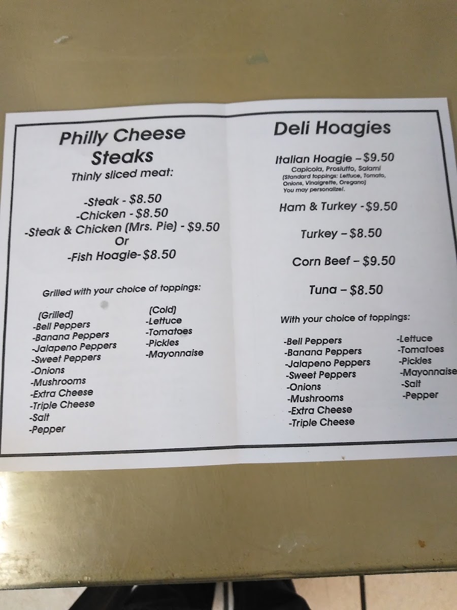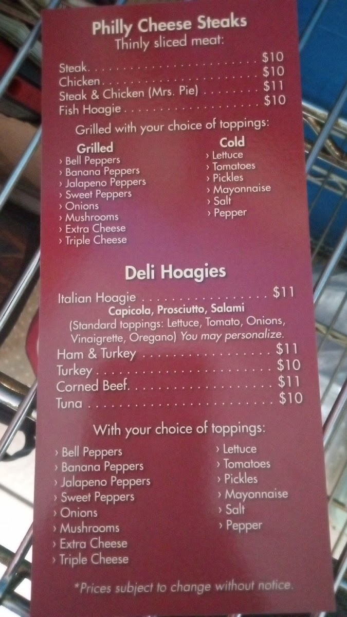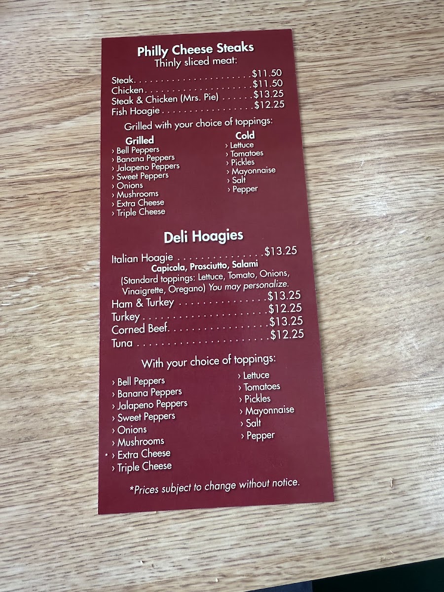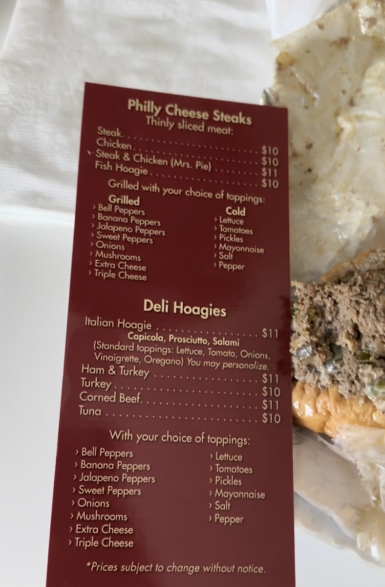 Guests often come here looking for a quick yet comforting meal, whether grabbing a substantial cheesesteak loaded with mushrooms and grilled onions or a cold cut party platter perfect for sharing. Popular choices like the Chicken Philly Sub with bell and banana peppers or the savory Mrs Pie indicate a menu built around familiar flavors that pair naturally with the friendly, down-to-earth atmosphere.